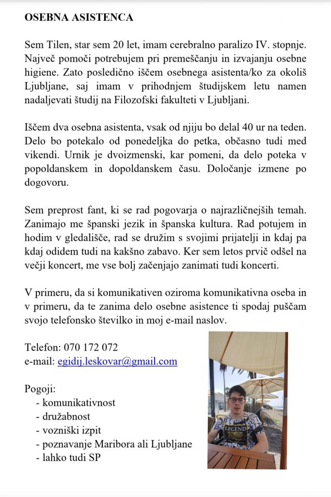 20-letni Tilen ima cerebralno paralizo IV. stopnje. V prihodnjem letu ima namen nadaljevati študij na Filozofski fakulteti v Ljubljani in išče dva osebna asistenta/osebni asistentki iz Ljubljane oziroma okolice Ljubljane.